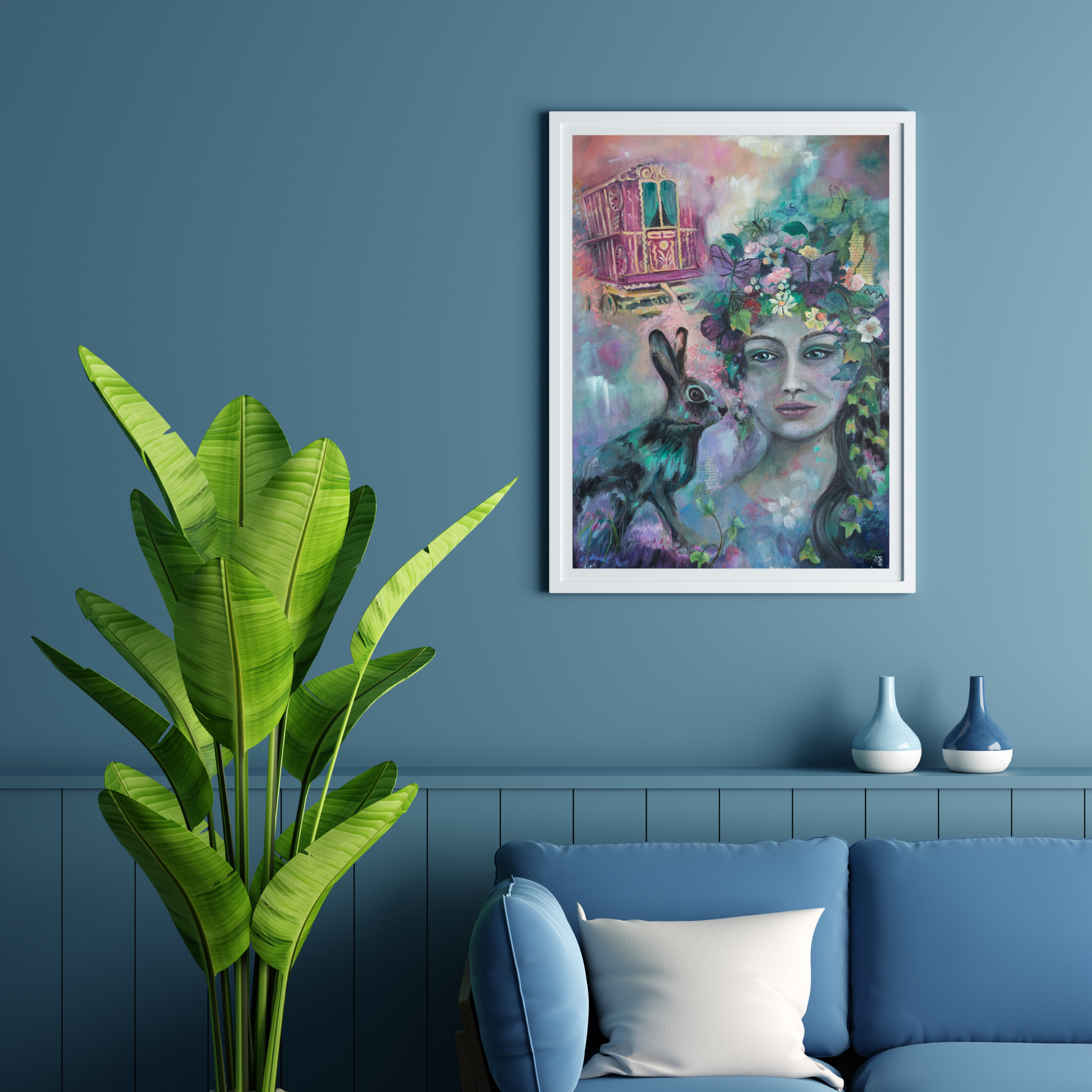 Nature Woman with a Hare and gypsy vardo. Mixed Media abstract painting on hand-stretched canvas. The artwork has been painted in several layers with high-quality paints. Collage, acrylic paint, acrylic pen, oil paint. The sides are painted and D rings have been added to the back, the artwork is ready to hang.
