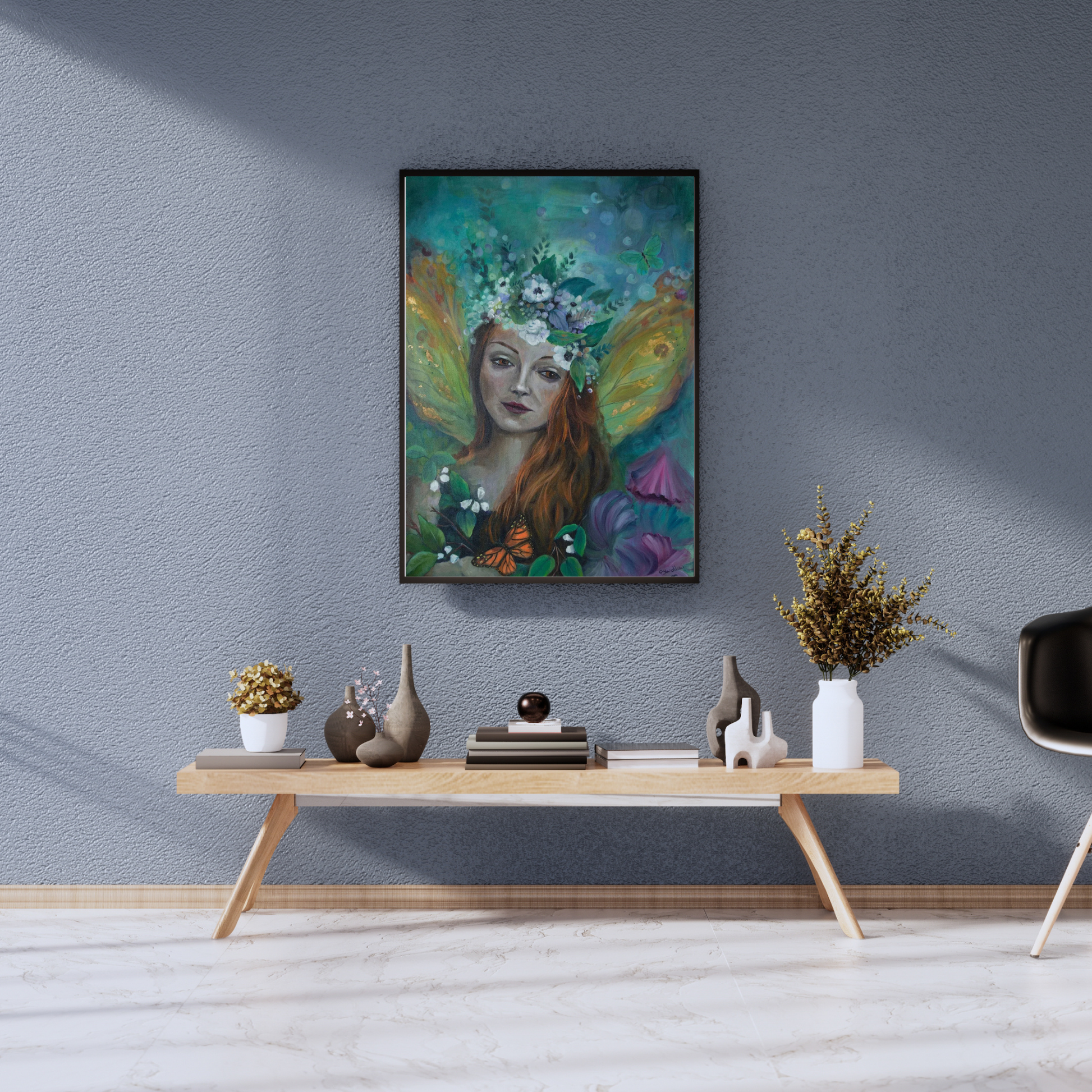 Fairy among the butterflies and flowers. Mixed Media on canvas. Painted on hand-stretched canvas in many layers with high-quality paints and varnished for protection. Inks, acrylic paint, oil paint, and imitation gold leaf. The sides are painted and D rings have been added to the back, the artwork is ready to hang.